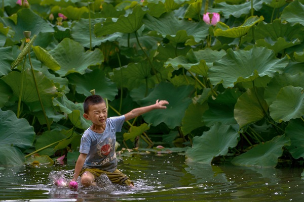 处暑时节,村口的荷塘成了孩童们嬉戏玩耍的游乐场,打水仗、摘荷花、追小鱼……孩子们尽情地撒欢,欢声笑语在青山碧水间回荡。(宗庆 摄)