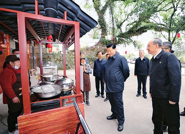 2021年3月22日至25日,中共中央总书记、国家主席、中央军委主席习近平在福建考察。这是23日下午,习近平在三明沙县夏茂镇俞邦村考察时,在小吃摊边同乡亲们亲切交谈。 新华社记者 王晔/摄