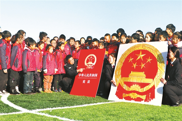 2014年11月1日,十二届全国人大常委会第十一次会议表决通过决定,将12月4日设立为“国家宪法日”。图为2021年12月3日,江苏省连云港市灌云县检察院、司法局工作人员到该县洋桥小学开展宪法宣传活动。 (图片来源:人民视觉)