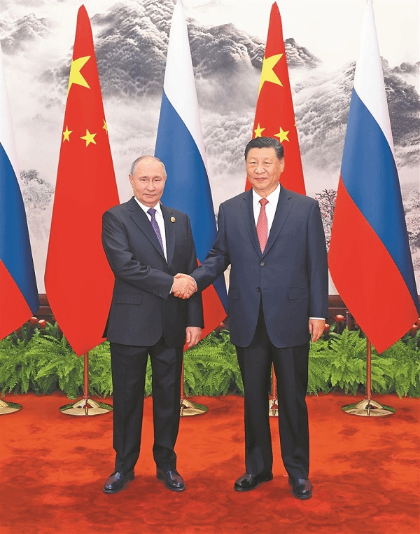 普京表示,我很高兴在就任新一届俄罗斯总统后再次访华。去年3月习近平主席也在连任后不久即对俄进行国事访问。这是我们两国的友好传统,表明双方对加强新时代俄中全面战略协作伙伴关系的高度重视。今年是中华人民共和国成立75周年,也是俄中建交75周年,值得我们共同庆祝。发展俄中关系不是权宜之计,不针对第三方,有利于国际战略稳定。俄方愿同中方持续扩大双边合作,密切在联合国、金砖国家、上海合作组织等框架内沟通协作,推动建立更加公正合理的国际秩序。