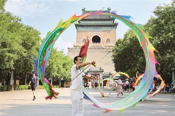 北京中轴线钟鼓楼广场,市民在欢快的乐曲声中舞动起龙形彩绸。 图片来源:视觉中国