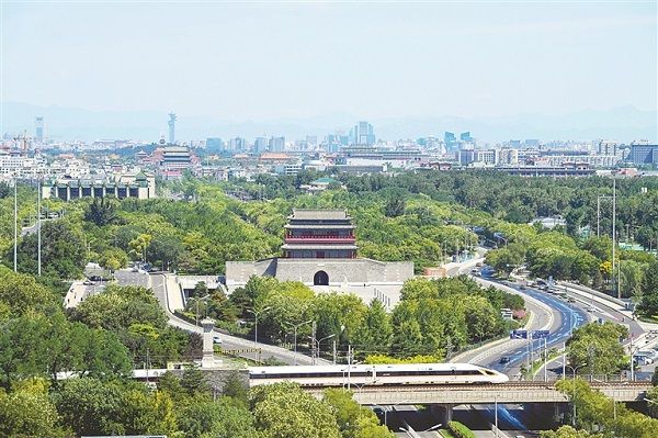 北京中轴线纵贯北京老城南北,始建于13世纪,形成于16世纪,此后经不断演进发展,形成今天全长7.8公里、世界上最长的城市轴线。图为一列复兴号高铁列车驶过北京永定门城楼前。 新华社记者 鞠焕宗 摄