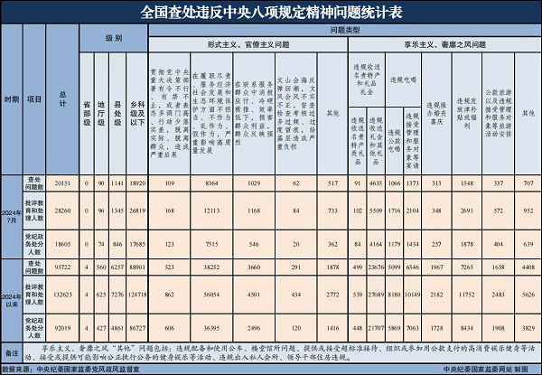 8月27日,中央纪委国家监委公布了2024年7月全国查处违反中央八项规定精神问题汇总情况。当月,全国共查处违反中央八项规定精神问题20151起,批评教育和处理28260人,其中党纪政务处分18605人,这是连续第131个月公布月报数据。