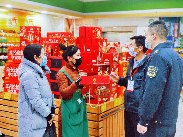 龙陵县春节纪律作风监督检查组在某超市年货销售点了解有关情况。王龙芹摄