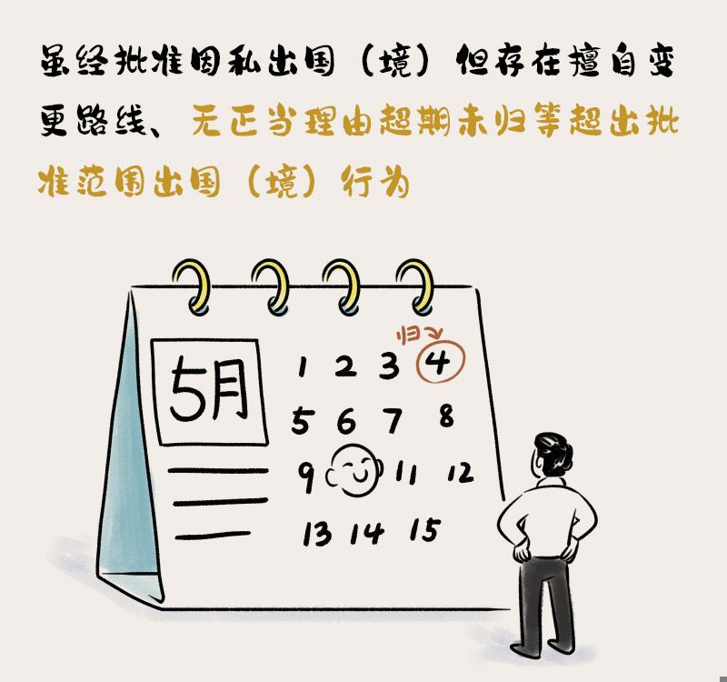 虽经批准因私出国(境)但存在擅自变更路线、无正当理由超期未归等超出批准范围出国(境)行为,情节较重的,给予警告或者严重警告处分;情节严重的,给予撤销党内职务处分。