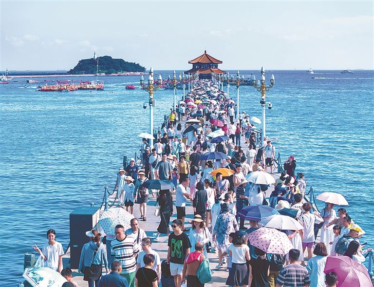 图为近日,大批市民和游客来到青岛的标志性景点栈桥景区游玩。