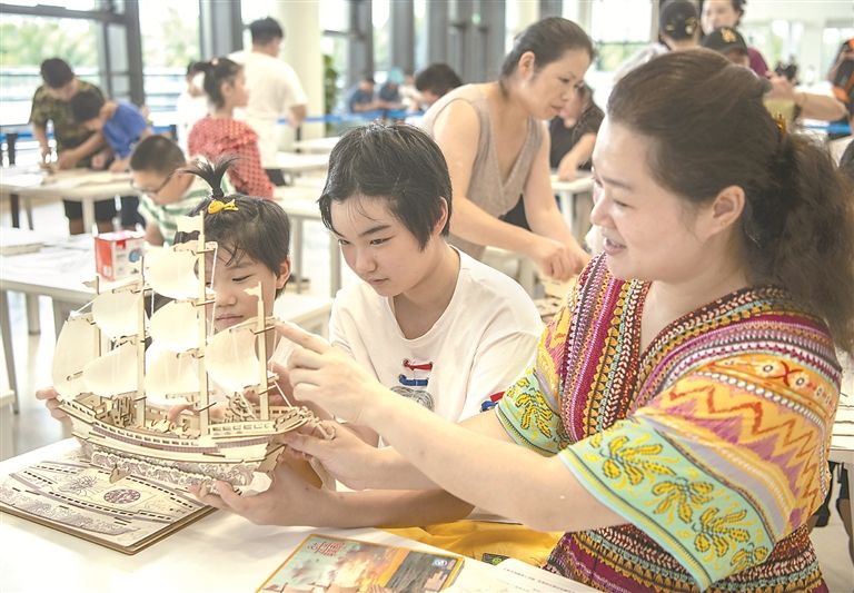 暑期以来,众多家长和小朋友在赶海季来到海南省琼海市中国(海南)南海博物馆,感受航海历史文化。图为近日,小朋友和家长在博物馆拼装船模。 图片来源:视觉中国