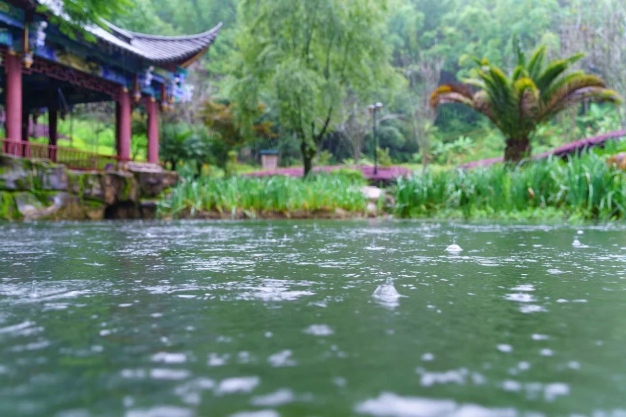 春雨潇潇润如酥。在龙陵县龙山镇东坡森林公园,雨水突然而至,打乱了山间的宁静。雨滴落在池塘上,发出清脆的啪啪声,仿佛在诉说着生命的旋律。(侯云鹏 摄)