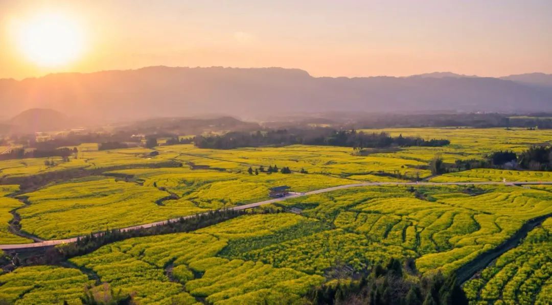 在腾冲市界头镇,盛开的油菜花形成了片片黄色花海山岭、村舍、道路、河流皆融入油菜花海,群山环抱,犹如一幅春日油画。(钏思伟 摄)