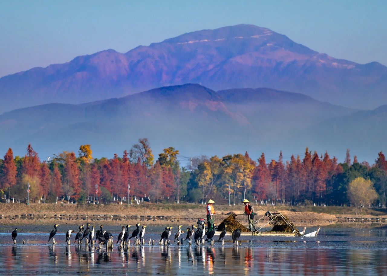 保山市隆阳区青华海国家湿地公园色彩斑斓,活泼的鹭鸶聚在一起看着工作人员清理水草,在春日暖阳下仿若一幅生机盎然的油画。(蔡庆彪 摄)
