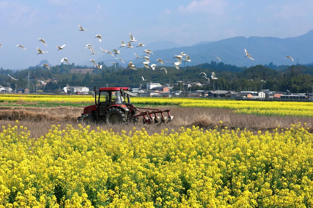雨水将至,春意盎然,腾冲市滇滩镇河西村农民抢抓节令翻耕农田,为春耕备耕忙碌,引来大量的白鹭追逐觅食,一幅人与自然和谐共生的美丽画卷在广袤的田野上徐徐展开。(龚祖金 摄)