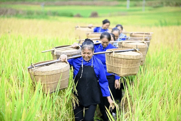 一根扁担,两个竹篾编织的箩筐,这是广南县八宝镇壮家人采收八宝贡米的传统工具。图为八宝镇壮族妇女在田间运送稻谷。 通讯员 王永强