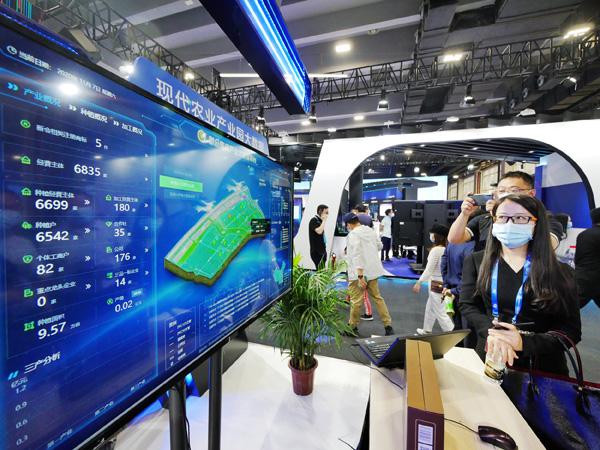 “十四五”规划纲要提出“加快数字化发展,建设数字中国”。迎接数字时代,需要激活数据要素潜能,以数字化转型整体驱动生产方式、生活方式和治理方式变革。图为广州智能生态博览会数字乡村平台,描绘出数字乡村建设中现代农业产业大数据、三农大数据、精准扶贫网络电商、人居环境、农业养殖、物流数据等有机融合高效管理的美好图景。(图片来源:人民视觉)