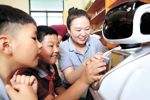 为缓解未成年人假期“看护难”问题,安徽省合肥市瑶海区试点免费提供音体美兴趣培养、公益看护、读书赏析、作业辅导、科技创新等为主要内容的“五彩假日”托管和教育服务。图为孩子们在和机器人做互动游戏。 新华社发(解琛 摄)