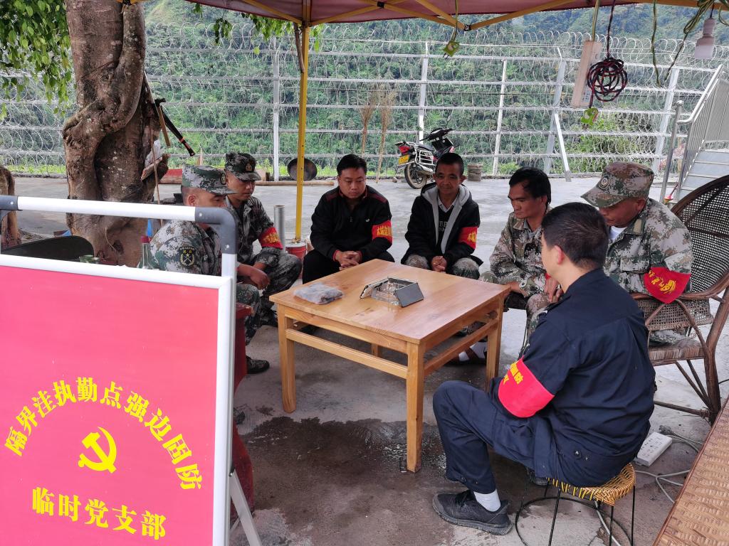 木城乡隔届洼执勤点强边固防临时党支部通过手机收听收看全会报道。(郭有和 摄)