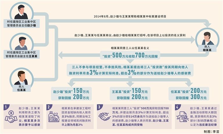其中,2014年8月,时任嘉陵区工业集中区管理委员会主任的赵少雄与嘉陵区工业集中区管理委员会副主任王某某(另案处理)帮助相某某中标嘉陵区某建设项目。之后,赵少雄利用职务上的便利,为相某某在该项目的施工、验收、拨款等方面提供帮助。其间,赵少雄、王某某与商人任某某(另案处理)商议,由赵少雄给相某某打招呼,在该项目上以“投资”的名义获利。相某某考虑到自己要感谢赵少雄、王某某的帮助,且在项目建设中需要筹措资金,同期也按照月息3%向他人融资,便同意三人以任某某名义“投资”500万元收取700万元回报,三人不参与项目经营,不承担风险。相某某提出,将三人“投资款”按同期向他人融资利率月息3%计算实际利息,超出3%的部分作为送给赵少雄等人的感谢费。赵少雄、王某某、任某某表示同意。2014年8月至2019年,赵少雄、王某某各“投资”150万元,并各获取回报200万元,任某某“投资”200万元,获取回报300万元。