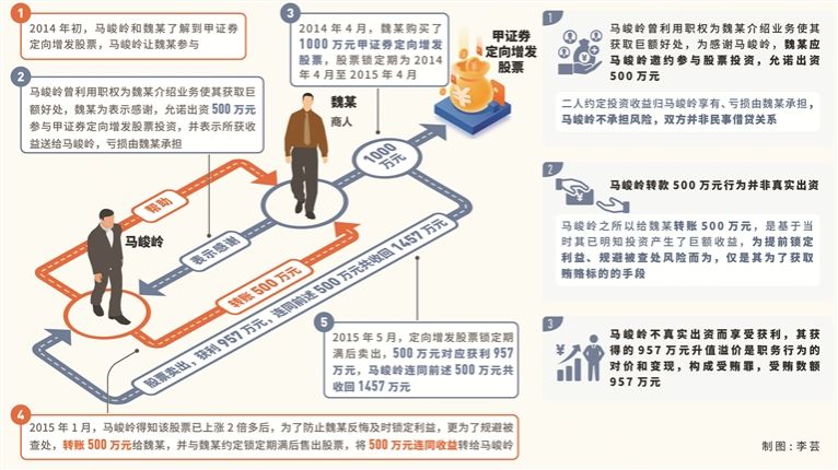 其中,2014年初,马峻岭和商人魏某等人了解到甲证券定向增发股票,马峻岭让魏某参与。马峻岭曾利用职权为魏某介绍业务使其获取巨额好处,魏某为表示感谢,允诺出资500万元参与甲证券定向增发股票投资,并表示所获收益送给马峻岭,亏损由魏某承担。2014年4月,魏某购买了1000万元甲证券定向增发股票,股票锁定期为2014年4月至2015年4月。2015年1月,马峻岭得知该股票已上涨2倍多后,为了防止魏某反悔并及时锁定利益,更为了规避被查处,转账500万元给魏某,并与魏某约定在股票锁定期满后出售股票,将500万元连同对应收益转给马峻岭,该500万元被魏某用于个人花销。2015年5月,魏某将定向增发股票在锁定期满后卖出,500万元对应获利957万元,马峻岭连同前述500万元转账共收回1457万元。