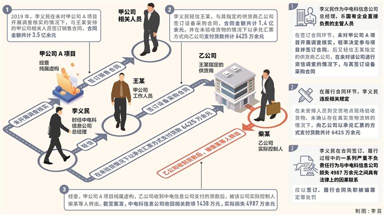签订、履行合同失职被骗罪。2019年,中电科信息公司工作人员郭某某(另案处理)从甲公司工作人员王某(另案处理)处得知,甲公司中标一个价值10亿元的A项目,希望能与中电科信息公司合作。郭某某将上述情况告诉时任中电科信息公司总经理的李义民,李义民为追求业绩,在未对甲公司A项目开展调查核实的情况下,与王某安排的甲公司工作人员签订销售合同,合同金额共计3.5亿余元,之后又与王某指定的供货商乙公司签订设备采购合同(即中电科信息公司从乙公司购进设备再销售给甲公司),合同金额共计1.4亿余元,并在未验收货物的情况下以承兑汇票方式向乙公司支付货款共计6425万余元。由于甲公司未能按照合同约定向中电科信息公司回款,2021年12月,李义民以中电科信息公司名义向郑州市公安局报案。经公安机关侦查,发现甲公司A项目纯属虚构,乙公司收到中电科信息公司支付的货款后,被该公司实际控制人柴某(另案处理)等人转出,用于归还欠款等。截至案发,中电科信息公司收回相关款项1438万元,实际损失4987万余元。
