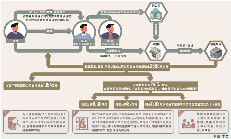贪污罪。2014年,百年春熙建投公司管理的A商铺对外出租期限将至,曾武在明知百年春熙建投公司规定承租方不得对外转租的情况下,授意李某竞拍A商铺,并寻找潜在转租对象以便后续转租获利。李某与杨某商议后,以丙公司名义参与竞拍。在曾武的帮助下,李某以丙公司名义获得了A商铺2014年11月2日至2019年11月1日的承租权,价格为每年130万元(低于市场价格)。承租后李某将A商铺直接转租给原租用方,价格为每年400万元至466.56万元不等。2019年7月,在曾武的操作下,李某再次以丙公司名义获得了A商铺2020年1月2日至2025年1月1日的承租权,价格为每年148万元(低于市场价格)。承租后李某仍然将商铺转租给原租用方,价格为每年450万元。截至案发,曾武、李某、杨某以丙公司名义共收到租金3509万余元,向百年春熙建投公司支付租金1094万元,获得转租利润2415万余元。每年分配转租利润时,均由李某与曾武商议,并由曾武决定三人的分配比例。最终,曾武分得转租利润1030万元,并用其中80万元购买房产,杨某分得87万元,剩余1298万余元由李某支配以及用于丙公司正常运营。