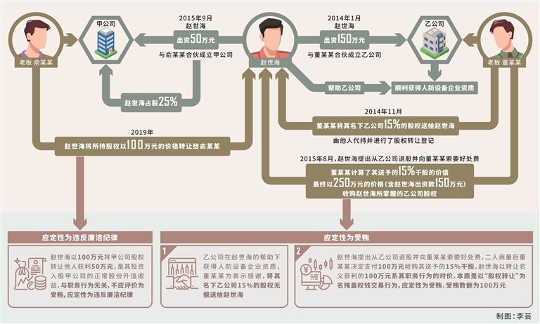 其中,2014年1月,赵世海出资150万元以他人名义与老板董某某合伙成立乙公司。董某某承诺如果乙公司能够获得人防设备企业资质,会额外赠送赵世海股权。之后,在赵世海的帮助下,乙公司顺利获得人防设备企业资质。2014年11月,董某某兑现承诺,将其名下乙公司15%的股权送给赵世海,由他人代持并进行了股权转让登记。2015年8月,赵世海提出从乙公司退股并向董某某索要好处费,此时乙公司暂未取得经营性收益,董某某计算了其送予赵世海的15%干股的价值(与2014年11月赵世海收到15%干股时的价值相同),最终以250万元的价格(含赵世海出资款150万元)收购赵世海所掌握的乙公司股权。