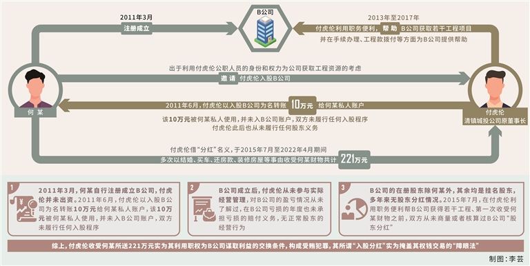 以投资入股分红名义收受贿赂221万元。付虎伦与B公司(工程建筑公司)法定代表人何某是多年朋友。2011年6月,付虎伦在何某成立B公司不久,曾以入股B公司为名转账10万元给何某私人账户,但双方没有履行入股法定程序,付虎伦也从未履行股东义务。2013年至2017年,付虎伦利用担任清镇城投公司董事长的职务便利,在项目获取、手续办理、工程款拨付等方面为B公司提供帮助,为此其借“分红”名义,于2015年7月至2022年4月期间,多次以结婚、买车、还房款、装修房屋等事由收受何某财物共计221万元。