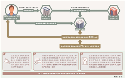 贪污罪。2013年5月至2017年12月,孟程利用担任神马建工集团郑州分公司经理的职务便利,以神马建工集团郑州分公司名义与马某某(神马建工集团郑州分公司原招采部部长,另案处理)实际控制的公司签订虚假购销合同,通过向神马建工集团提出拨款申请的方式,先后3次贪污神马建工集团公共财物398万余元人民币(币种下同),其中包括虚开发票缴纳的税款27万余元。