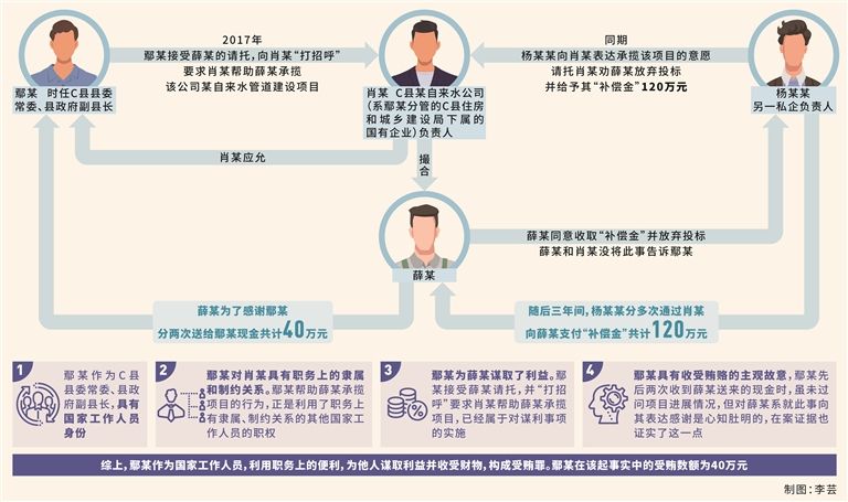 其中,2017年,鄢某在担任C县县委常委、县政府副县长期间,接受商人薛某的请托,向C县某自来水公司(系鄢某分管的C县住房和城乡建设局下属的国有企业)负责人肖某“打招呼”,要求肖某帮助薛某承揽该公司某自来水管道建设项目,肖某应允。同期,另一私企负责人杨某某向肖某表达承揽该项目的意愿,请托肖某劝薛某放弃投标并给予其“补偿金”120万元。经肖某撮合,薛某同意收取“补偿金”并放弃投标。薛某和肖某没将此事告诉鄢某。最终,在肖某的帮助下,杨某某公司顺利中标该项目。随后三年间,杨某某分多次通过肖某向薛某支付“补偿金”共计120万元。薛某为了感谢鄢某,分两次送给鄢某现金共计40万元。
