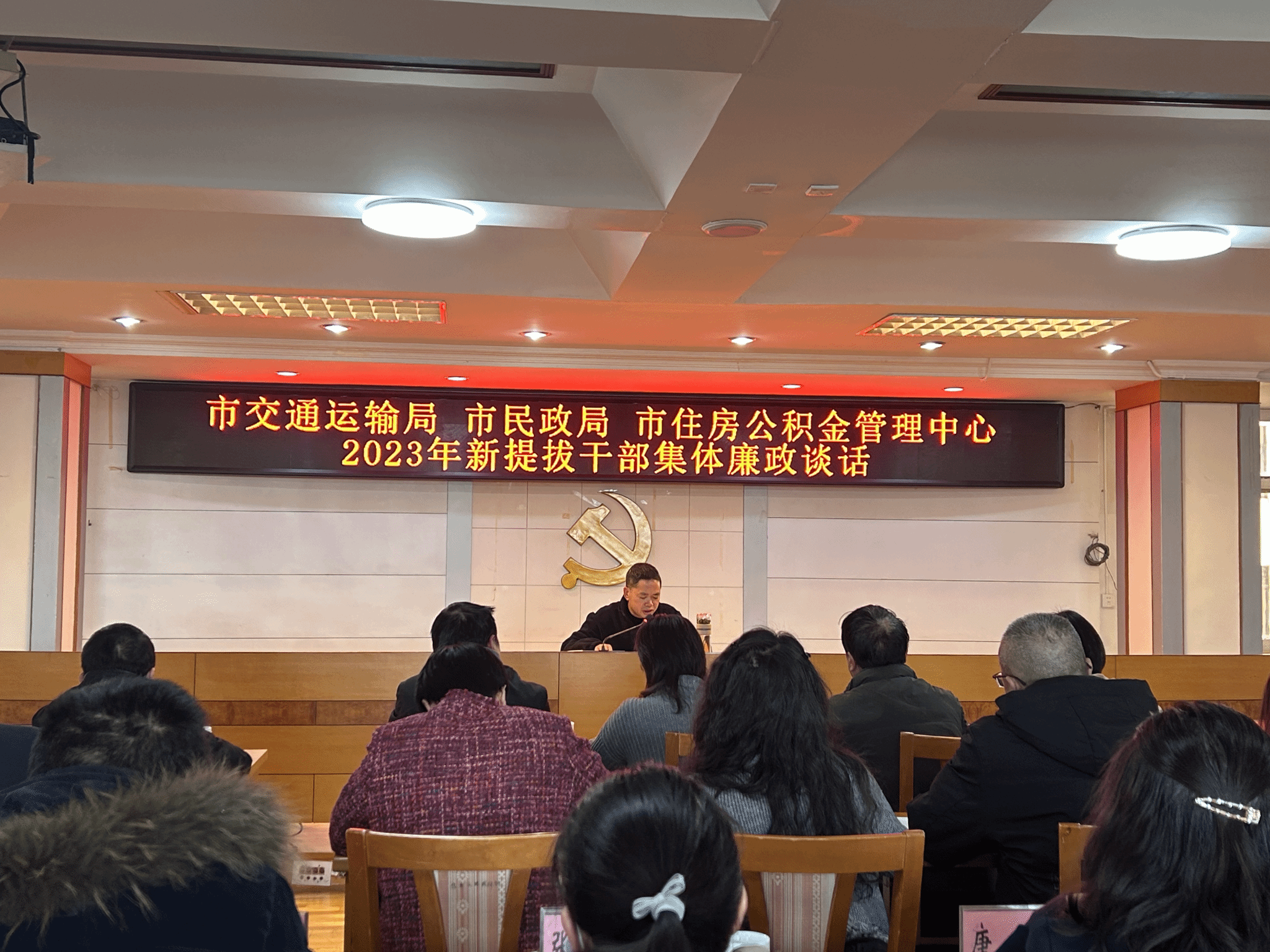 近日,为筑牢新提拔干部及年轻干部廉洁自律“防火墙”,切实加强对重点部门、重要岗位人员的教育引导,派驻市交通运输局纪检监察组对市交通运输局、市民政局、市住房公积金管理中心2023年新提拔的25名干部开展集体廉政谈话。