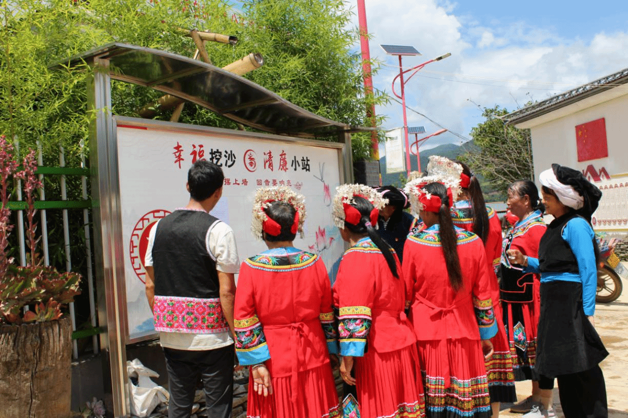 昌宁县把清廉村居建设与基层治理紧密结合起来,建设“清廉小站”,进一步畅通村情民意反映渠道,有力助推清廉村居建设迭代升级。图为耈街乡挖沙村群众在“清廉小站”前讨论村委会反馈意见。李佳鹏摄
