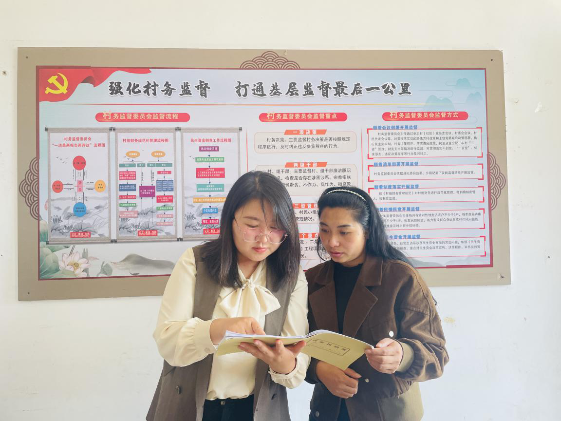 (图为龙江乡纪委在邦焕村委会检查有关账目)