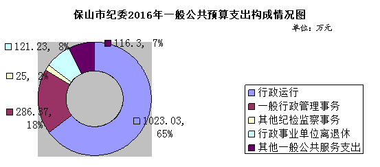 一般公共服务支出1,571.96元,占一般公共预算财政拨款总支出的100%。主要用于行政运行1,023.06万元,一般行政管理事务286.37万元,其他纪检监察事务支出25万元,其他一般公共服务支出116.30万元,行政事业单位离退休121.23万元,具体构成情况如下图所示: