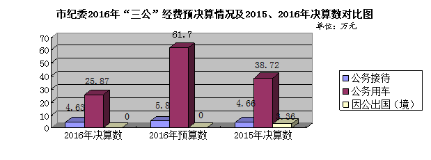 2016年度,保山市纪委“三公”经费财政拨款支出决算总额30.50万元,其中,无因公出国(境)费支出;公务用车购置及运行维护费支出25.87万元,占84.82%;公务接待费支出4.63万元,占15.18%。具体情况如下: