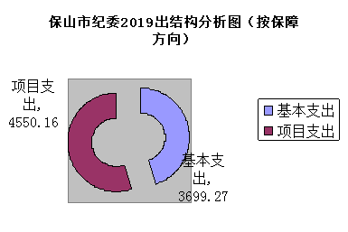 保山市纪委市监委2019年度收入合计82323123.86元,其中:财政拨款收入82323123.86元,占总收入的100.00%; 2019年度支出合计82494302.59元,其中:基本支出36992715.59元,占总支出的45.00%;项目总支出45501587.00元,占总支出的55.00%。
