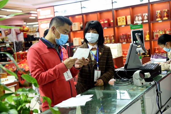 河口县纪委监委联合税务、市场监管等部门开展节前监督检查,深入各大超市、商场,利用查阅出货凭证、调阅开票记录等方式,把公车私用、公款消费、违规接受管理服务对象宴请等纳入监督检查重点。(余猛 摄)