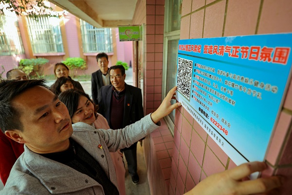陆良县同乐街道纪工委干部在某小区张贴监督牌,鼓励群众参与监督。(王勇 摄)
