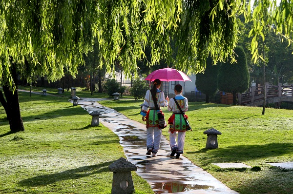 寒意渐去,春光渐浓,各种花草树木尽情吐露芬芳。两位彝家女子漫步柳树下,阵阵芳香沁入心扉,处处美景赏心悦目。(卢纪萱 摄)