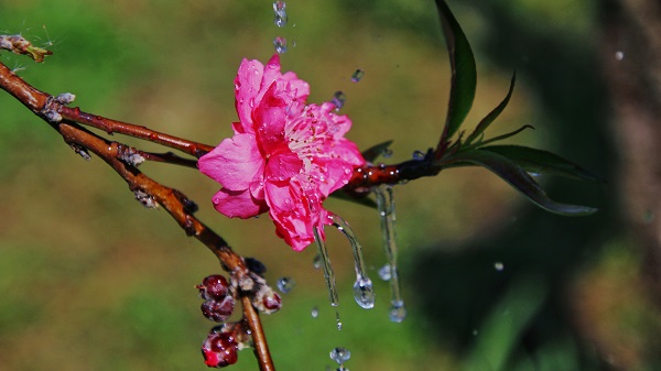 盛放的桃花,仰着脸庞,渴望着雨水的滋润。雨水过后,羞红脸的桃花更显娇艳。(王升琼 摄)