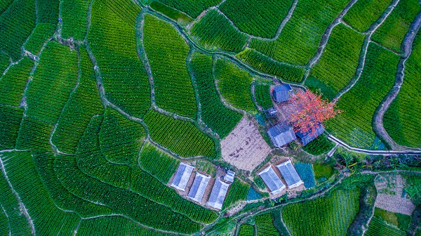 雨水前后,怒江畔的香料烟滋滋生长,犹如绿色的地毯铺在田野上,火红的木棉花和白色房子,在绿波中闪光,大地的色彩开始斑斓起来。(朱昌维 摄)