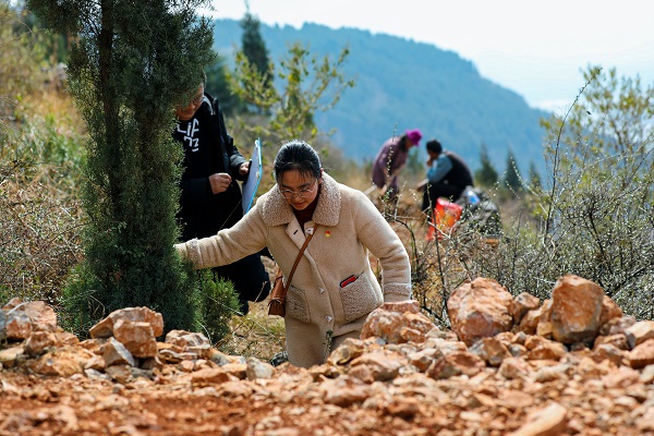 深入基层监督执纪的女纪检监察干部巾帼不让须眉,柔中带刚、勇于担当。陆良县三岔河镇纪委干部步行上山开展走访。(王勇 摄)