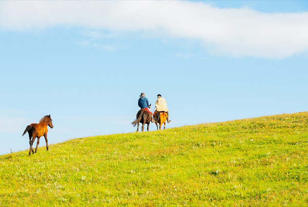 温暖的春风吹拂而来,随着气温的上升,大地逐渐找回了生气。阳光洒在嫩绿的草地上,人们趁着这难得的好天气骑马漫步,享受这美好的春日时光。(税昌海 摄)