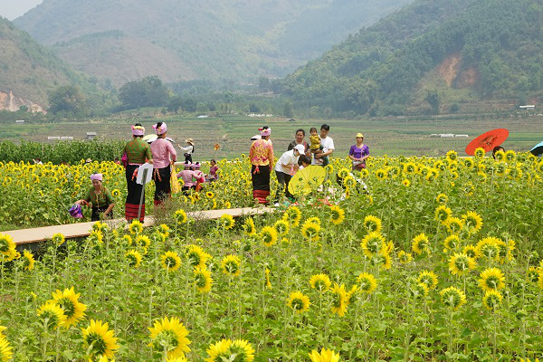 春分时节,芒市遮放允午贡米基地的向日葵盛开,寨子里的毕朗(傣语:大姐)身着盛装,和家人一起感受春日的美好。(冉清雯 摄)