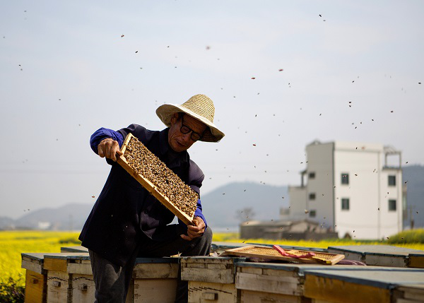 泸西县的蜂农趁着天气晴好,逐个儿打开蜂箱、取出蜂巢,给蜂群更换新蜂王,只为酿出更多更甜的蜂蜜。(陈运龙 摄)