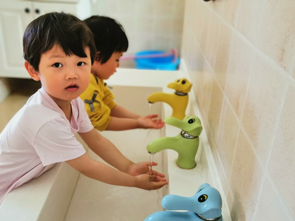 “内外夹弓大立腕”,在东川区金苹果幼儿园,小朋友每天都按照老师教授的七步洗手法洗手,自觉养成讲卫生、勤洗手的好习惯。(朱兴凤 摄)