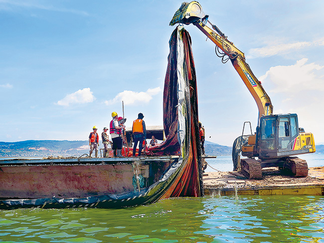 图为杞麓湖国控水质监测点周边的柔性围隔被拆除。刘雪飞 摄