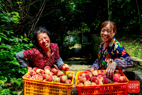 大暑时节,正逢蜜桃成熟之时,娇嫩的果皮上印着夏日的热情,一筐筐沉甸甸的蜜桃带来了丰收喜讯,农户们脸上满是笑容。(四川省彭州市纪委监委供 杨杰 摄)
