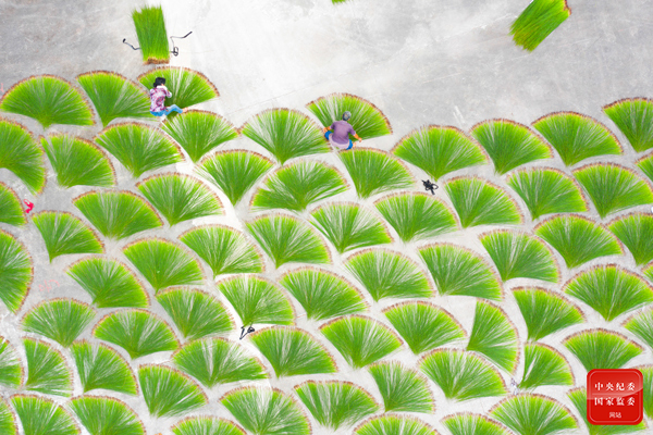 席草可加工成草席、草帽等日用品,在浙江省永康市舟山镇,晾晒席草的农民将铺在空地上的席草摆成扇子形状,构成一副美丽的丰收画卷。(浙江省永康市纪委监委供 张汉平 摄)