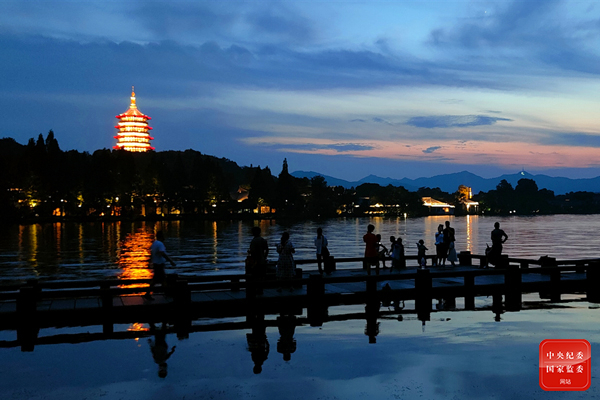 大暑时节,酷热难挡。傍晚时分,人们走出家门来到西湖边,享受几缕清凉。(杭州市上城区纪委监委供 应莉霞 摄)