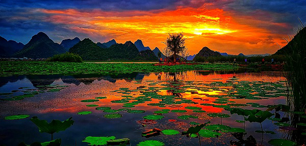 日暮黄昏,霞映荷塘,莲花次第开放。莲香散溢,拂去夏日的炎热,让人心旷神怡。(梁艳 摄)