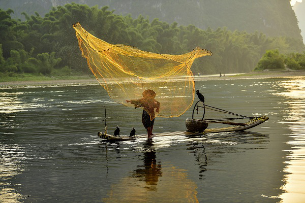 傍晚,勤劳的渔民划着竹筏,撒网捕鱼,忙碌的身影倒映在水面上,描绘出一幅辛勤劳作的农家画卷。(陆忠 摄)
