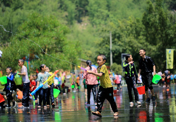 盛夏时节,剑川县沙沟尖村组织划船比赛,村民们在戏水娱乐中享受清凉一刻。(王开华 摄)